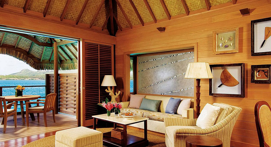 The Four Seasons Bora Bora has some of the most beautiful and spacious overwater bungalows with a minimum 1080 square feet. Check out the 1120 sq. ft. Overwater Bungalow Suite with pool, with an amazing view of Mount Otemanu.
