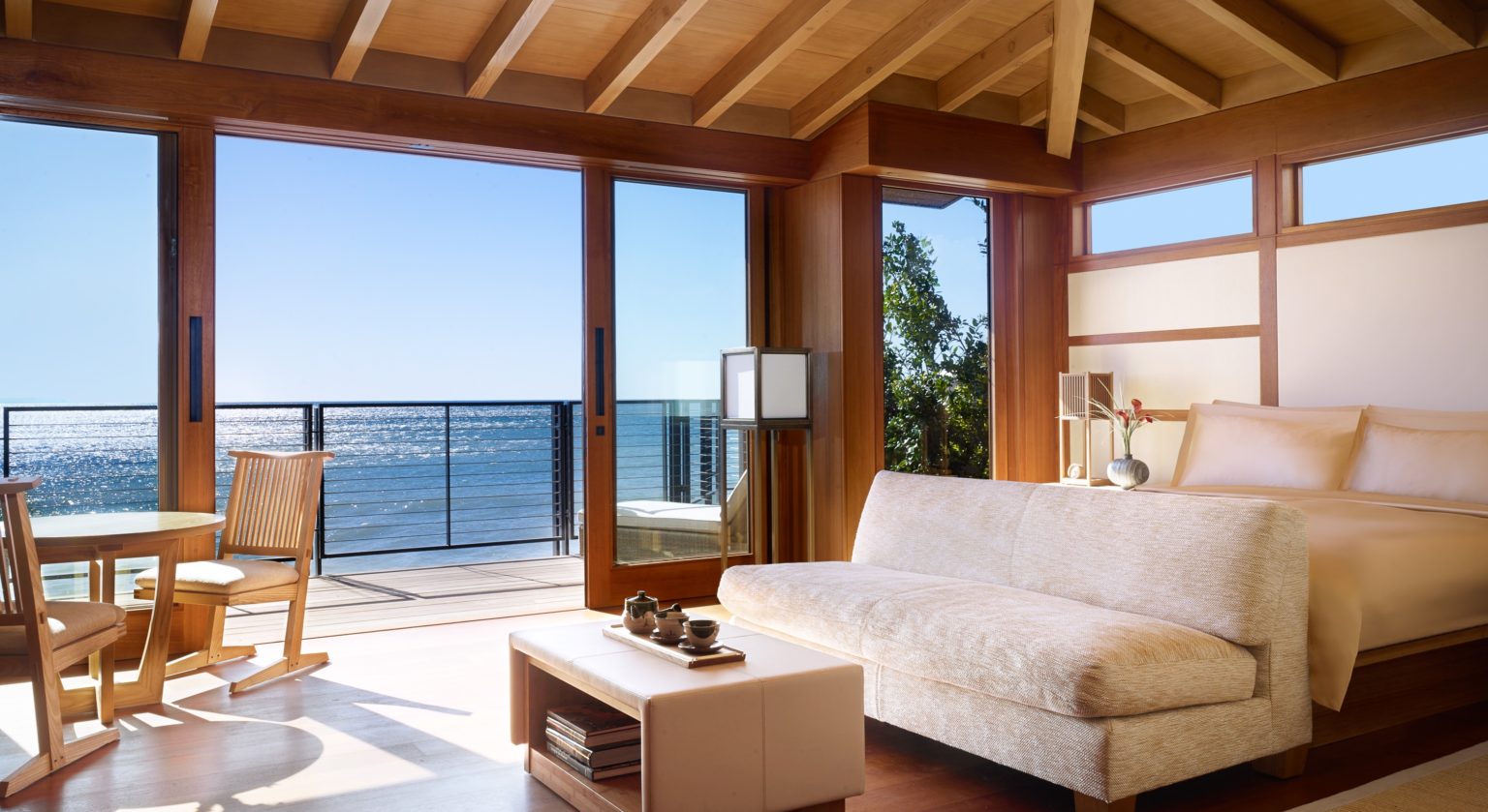 Each of the property’s 12 rooms and 5 oceanfront bungalows were individually- designed to offer a unique guest experience. Natural California views are combined with Japanese design elements such as tatami mats, shoji screens, sand- colored limestone walls and hand-crafted teak soaking tubs placed beneath skylights to create an ambiance of tranquility and relaxation.